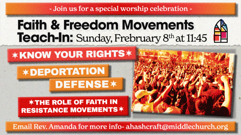 Middle Church is a multicultural, multiethnic, intergenerational movement of Spirit and justice, powered by fierce, revolutionary Love, with room for all. We are an LGBTQ+ and Queer-affirming church, committed to healing souls and the world by dismantling racist, classist, sexist, ethnocentrist, ableist, and cisheterosexist systems of oppression.