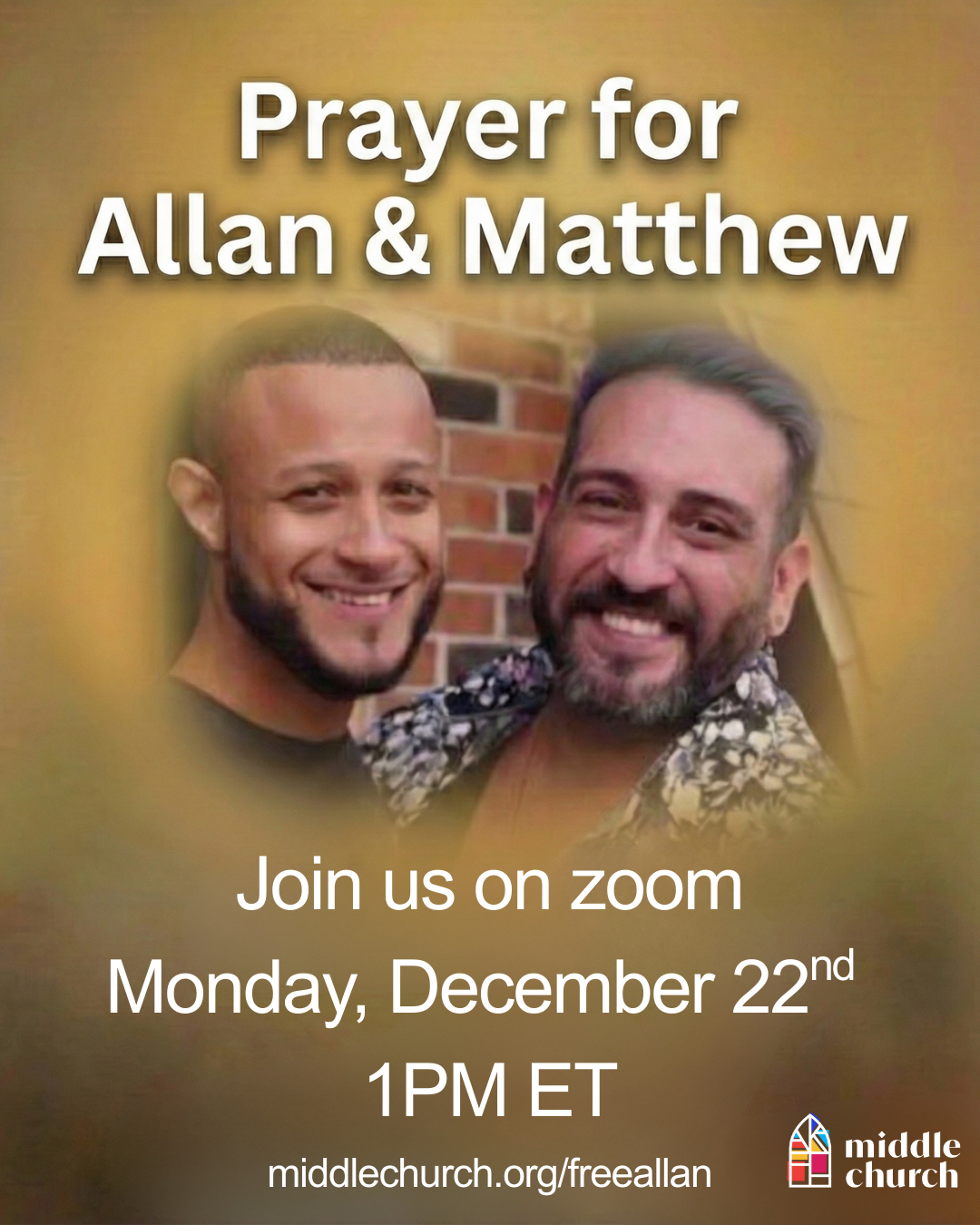 Join us 12/22 at 1pm ET on Zoom as we pray for Matthew and Allan. Allan is detained and our prayers, our presence, and our collective witness matter. This is who we are. Learn more at middlechurch.org/freeallan.