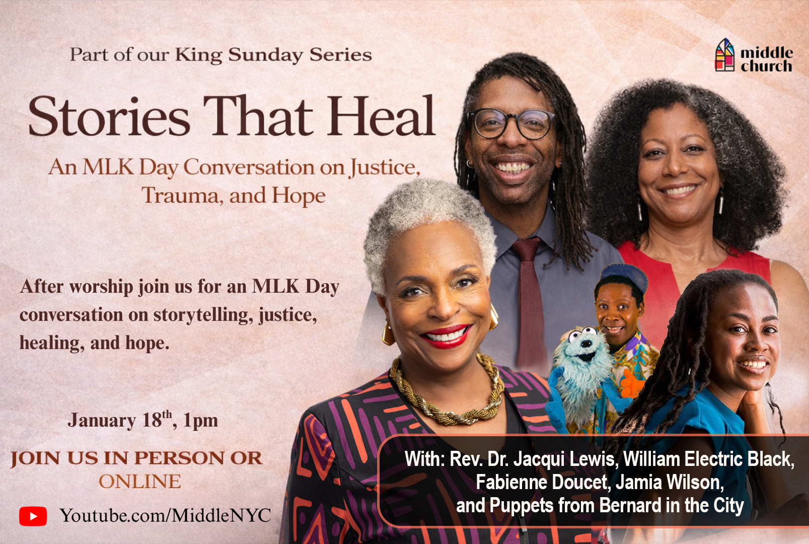 Following worship on MLK Day, join Rev. Dr. Jacqui Lewis and children’s book authors Jamia Wilson, Fabienne Doucet and William Electric Black for an intergenerational anti-racism training rooted in storytelling, spirituality, and soul work. Together, we will explore how stories help us name pain, heal across generations, and practice justice in ways that are honest, hopeful, and life-giving.
