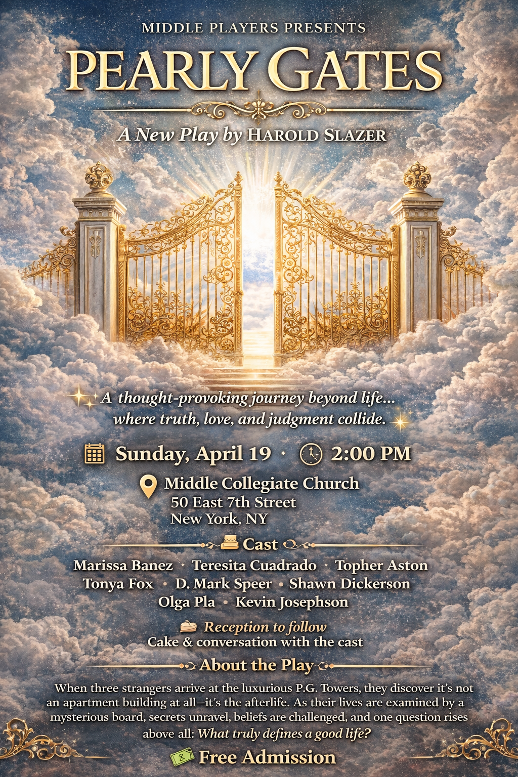PEARLY GATES A New Play by Harold Slazer A thought-provoking journey beyond life, where truth, love, and judgment collide. Sunday, April 19 at 2:00 PM Middle Collegiate Church 50 East 7th Street New York, NY Cast Marissa Banez Teresita Cuadrado Topher Aston Tonya Fox D. Mark Speer Shawn Dickerson Olga Pla Kevin Josephson Reception to FollowCake and conversation with the cast About the PlayWhen three strangers […]